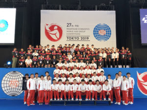 この大会は、多くの東京五輪組織委員会の皆さんと、また、多くのトランポリン関係者、日本体操協会関係者、中でも学生さんの大きな力で運営を乗り切りました! 我々に取っても初の世界選手権・世界年齢別大会の運営でしたが、FIG (国際体操連盟) の皆さんの協力やアドバイス、その他運営には欠かせない方々のご協力で大成功に終わったと自負しております。皆様、本当にありがとうございました! またこのチームで東京五輪を成功させたいと思います! 大会最後にいらっしゃったスタッフの皆さんと、最後の片付けにエールをくれた、また感謝の言葉をくれた世界年齢別日本代表選手とスタッフの皆さんで写真を撮りました!