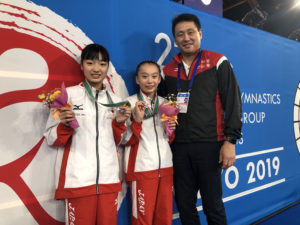 2019年12月5日 (木) 〜 8日 (日) 東京五輪の体操競技が行われる「有明体操競技場」にて、全週の「世界トランポリン」に引き続き、ジュニア選手の世界大会「第27回世界年齢別トランポリン競技大会」が開催され、当クラブの石田美咲希選手 (睦合東中 1年) が、大阪のアインストランポリンクラブの小野晴茄選手 (中3) とペアを組み、見事シンクロナイズド競技で銅メダルを獲得しました!